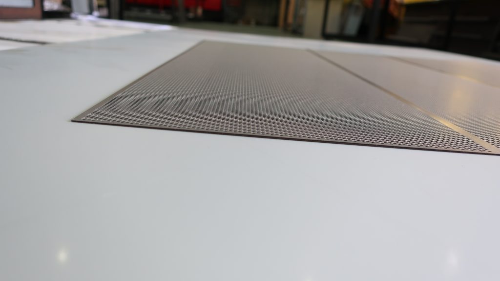 反り防止金型でパンチング加工! SPCC t1.0 750 x 240 φ2 ピッチ3 60° パンチングヒット数は22,028回ですが ほとんど歪みがありません!! 現在の保有金型 φ1.8 φ2 加工板厚範囲 SPCC t0.8~1.2 , SUS t1.0